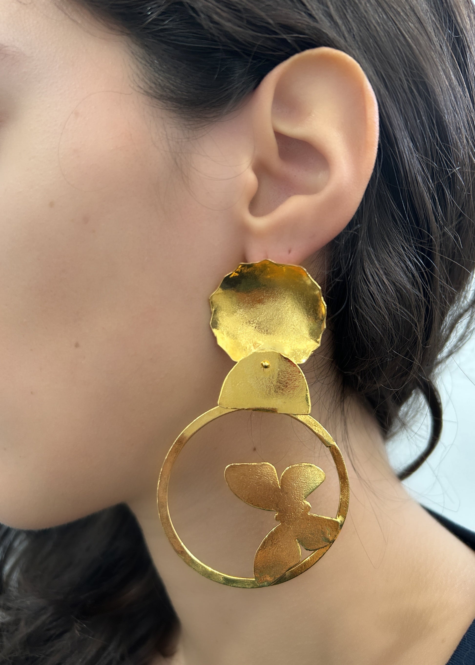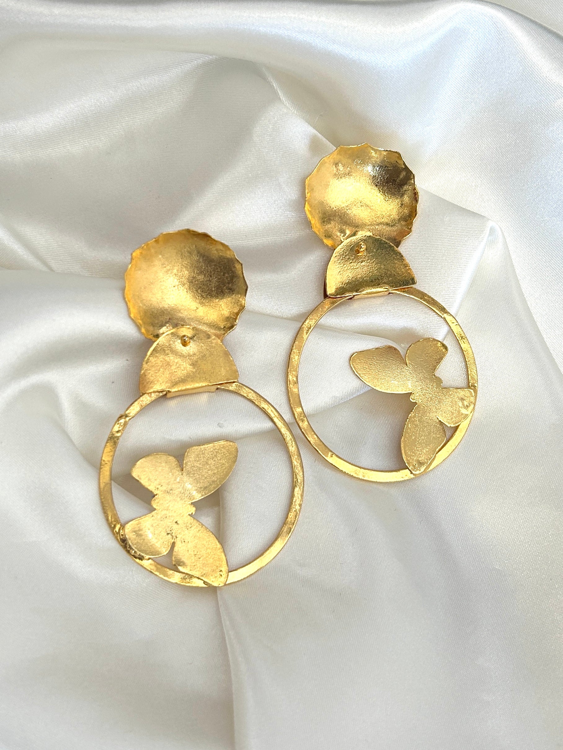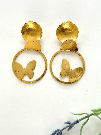 These earrings feature a modern and delicate design: a golden butterfly floating inside a circular frame. With a sleek, shiny finish, they blend subtle elegance with contemporary charm. Perfect for women who love refined details that still make a statement. Ideal to elevate any outfit from day to night.