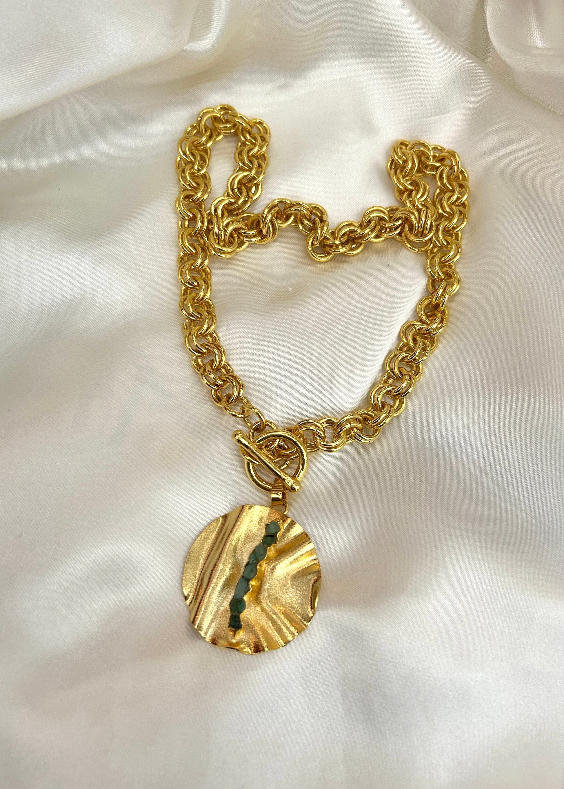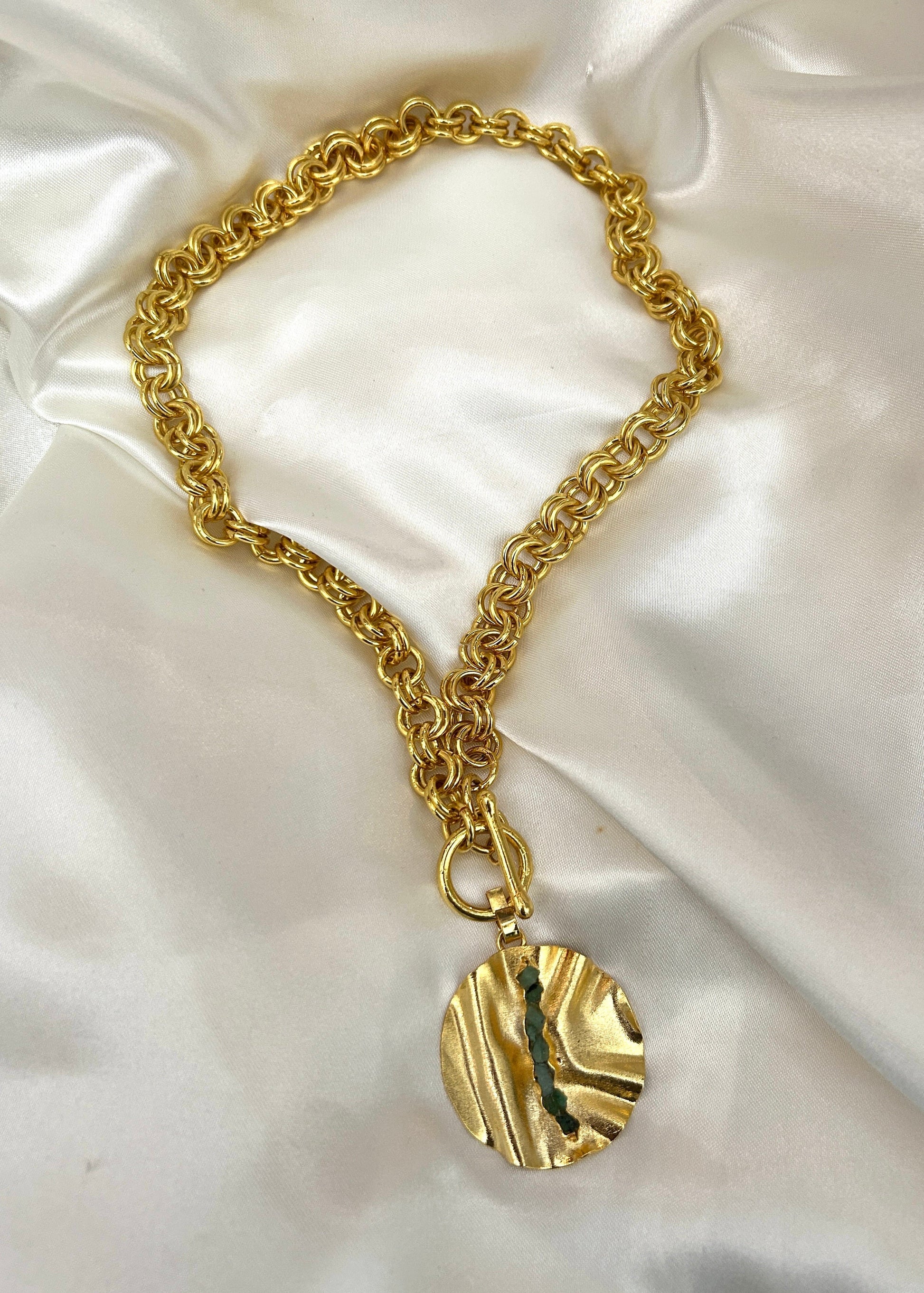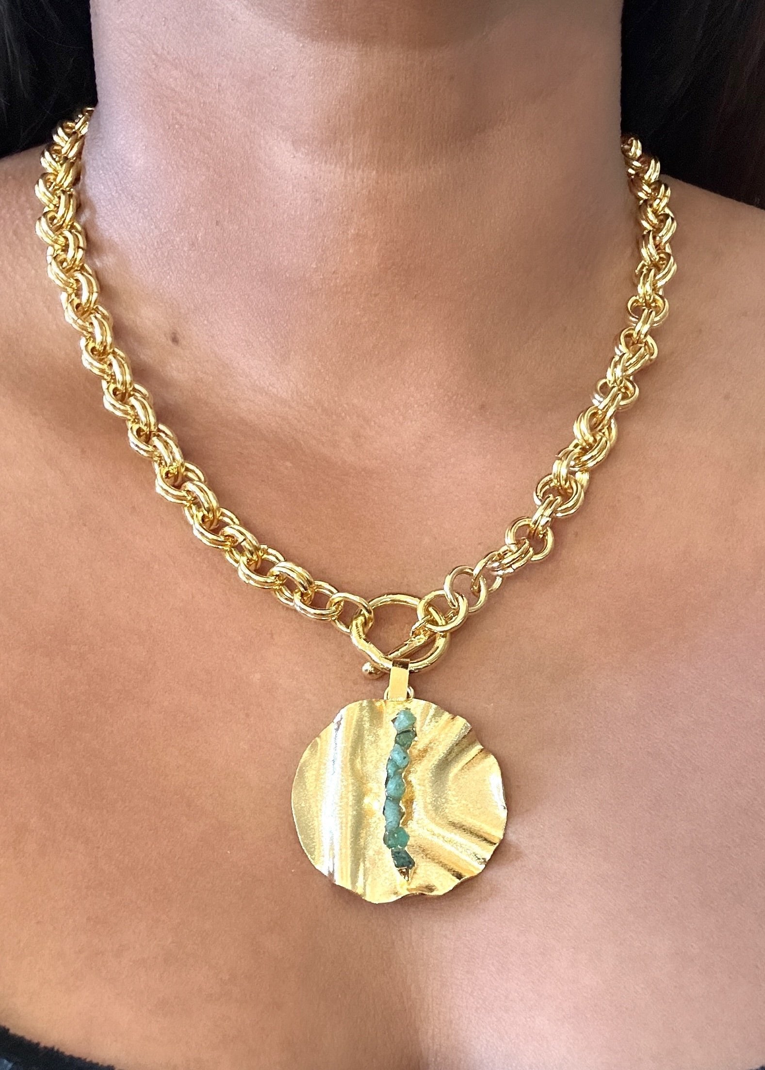 Unveil the captivating beauty of nature with this chain and pendant featuring raw emeralds in their most authentic form. Combining the raw elegance of natural gemstones with the luxurious finish of gold, this pendant makes a bold, sophisticated statement that exudes power and grace. Perfect for those who appreciate the raw beauty of nature and the elegance of fine craftsmanship, this chain and pendant are destined to become a treasured piece in your collection.