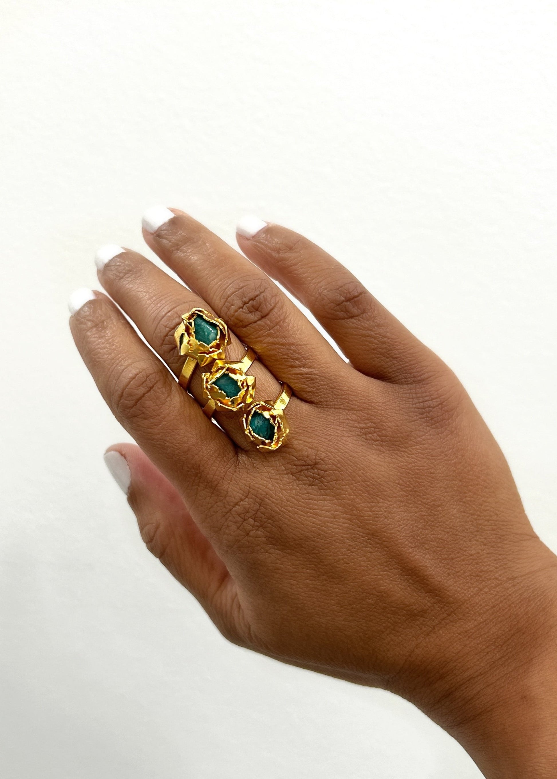 Imagine the Sisters ring featuring three vibrant Amazonite stones set against a backdrop of gold plating, creating an elegant and eye-catching design. The ring's band is delicately handcrafted from high-quality gold-plated bronze, with a soft, matte finish that complements the stone's lively hues.
