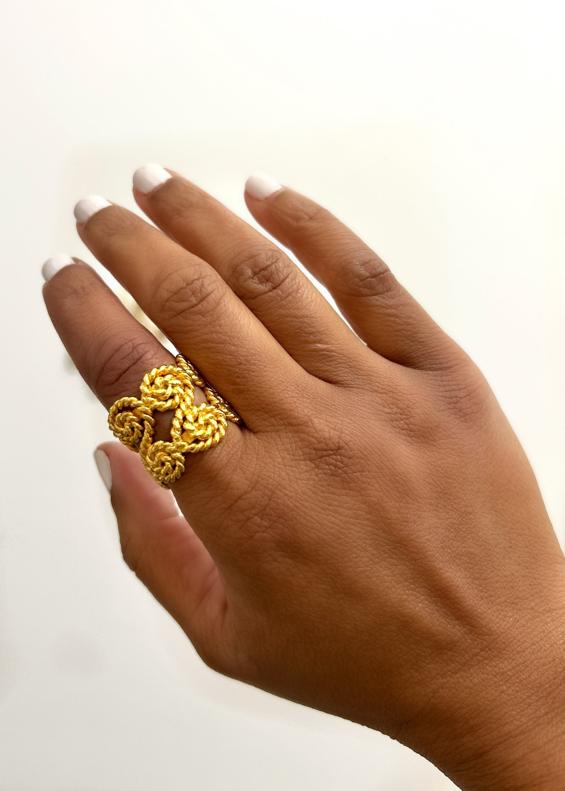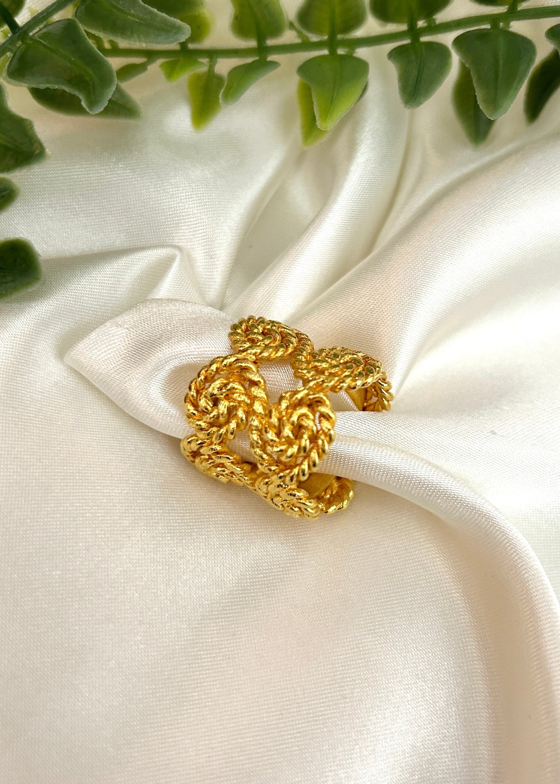 This gold-plated braided ring is a fusion of elegance and artisanal skill. Each strand of the ring intertwines seamlessly, creating a sophisticated braid that captures the essence of timeless style. The gold plating gives it a radiant, luxurious shine that complements the intricate weaving.